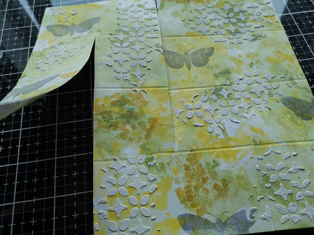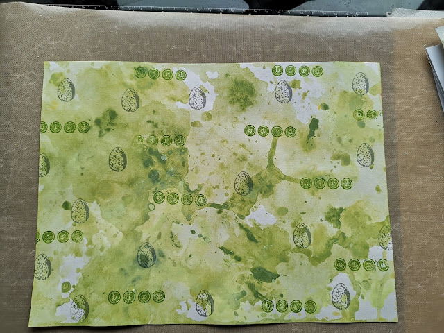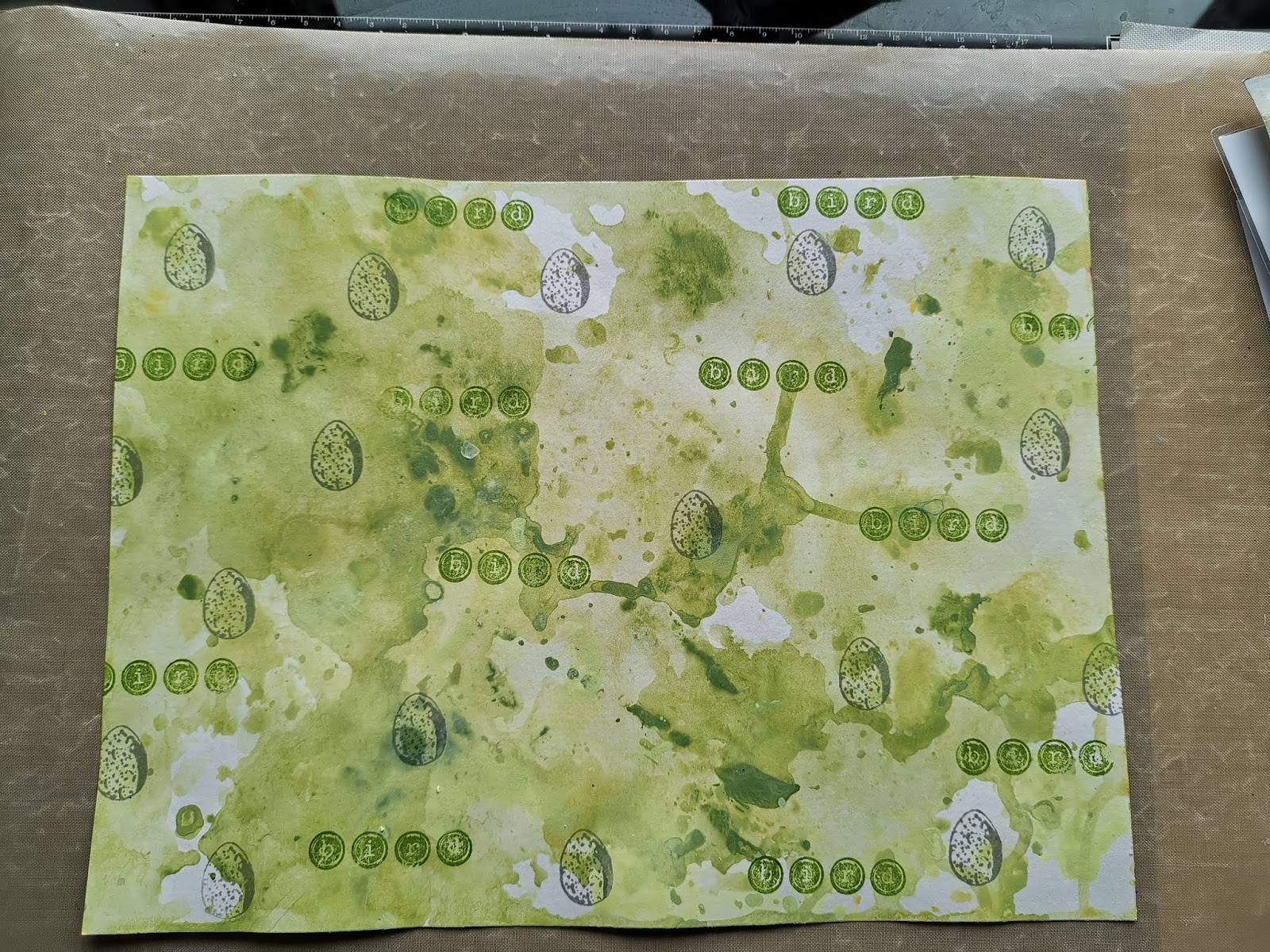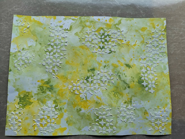 I started by decorating both sides of a sheet of card stock. I used Fresco Acrylics in Zucchini, Teresa Green and Zesty Zing to create a wrinkle free distress look.