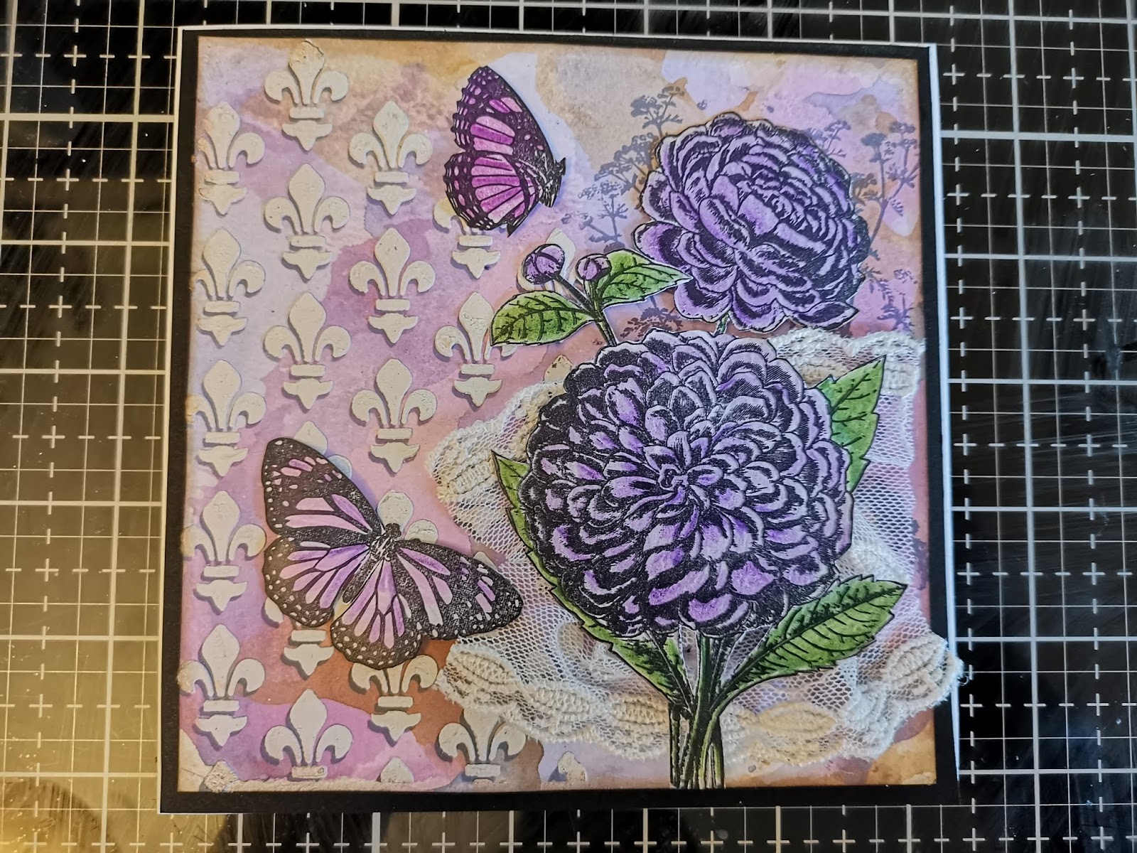 I then started to layer everything up, adding vintage lace behind the flower. To finish this was mounted onto black card and then onto a card blank.